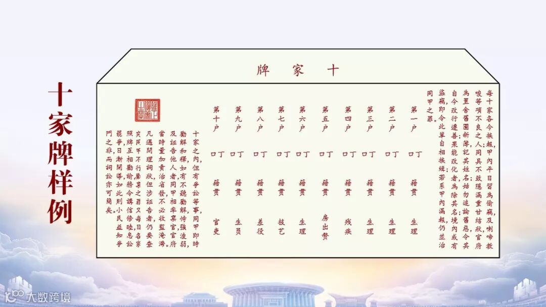 十家牌法,即将十家分为一组——“凡置十家牌,须先将各家门面小牌挨审的实。十家编排既定,照式造册一本留县,以备查考。及遇勾摄及差调等项,按册处分,更无躲闪脱漏”,牢固地将十个家庭绑在一起。