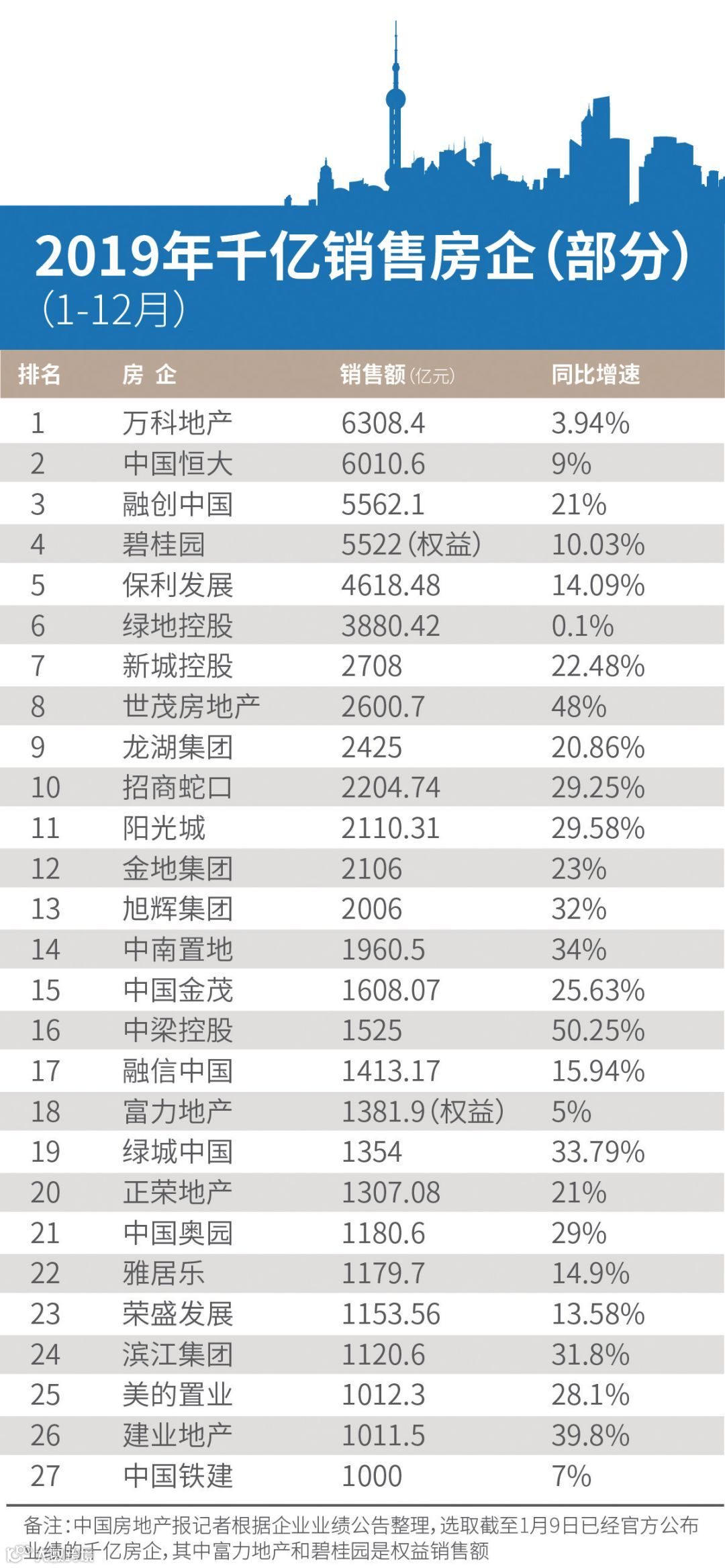 截至目前仍有多家房企未公布其2019年全年业绩,中国房地产报记者综合房企业绩公告以及第三方机构的数据测算,2019年房地产行业千亿房企将达到34家。