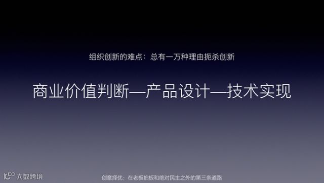 OKR(我们在创新业务上用OKR替代KPI)是这个阶段检验组织效率的一个有效工具。没有有效分解关键结果,就不会实现阶段性的目标。通过这三年半的努力,我们已经初步打磨出了一支能指哪打哪的团队。如何把现有团队改造成特种兵模式,去适应前面更大的挑战,是当下我们要快速学习的课题。