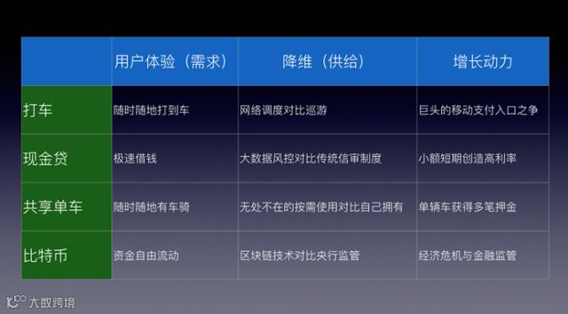 我们再综合分析打车、现金贷、共享单车、比特币这四个产品。从供给端来看,都是新的技术得到了成熟的应用,包括网络调度、大数据风控、智能锁、区块链,这些技术使得新的供给能力成为可能,这种供给能力,满足了原来就存在的被抑制的巨大需求,带来10倍的体验提升。包括比特币这个模式解救了无数无法兑换成美元的某些法币。这些公司都获得了降维打击的能力。