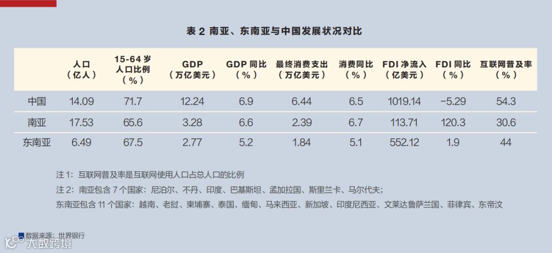 庞大而年轻的人口、制造业的飞速发展,是南亚和东南亚两个地区的巨大优势。另外,由于互联网人口数量巨大,起步时间较晚,这些国家跨过了PC互联网的发展阶段,直接进入了移动互联网阶段,基于移动互联网的很多产业快速成型,经济发展及转型成本很低。