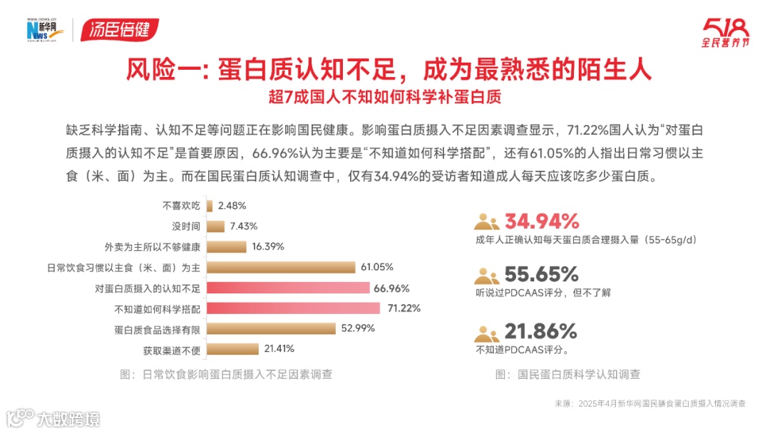汤臣倍健发布的国民蛋白质认知调查数据显示,受访者中有45%的人没有吃够蛋白质,超七成国人不太懂科学补充蛋白质,优质蛋白的摄入也远未达到理想状态。