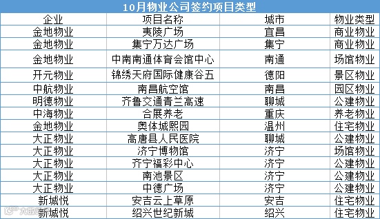 不完全统计所得,10月发生的签约项目事件15宗,其中涉及住宅物业仅3宗,商业物业2宗,公建物业5宗。观点研究院认为,公建建筑很大程度上会代表城市的公众形象,具有较大的社会关注度。但由于公共建筑一般是由公共财政或公益机构进行运营和维护,对资金使用的程序性和法规性限制较为严格,且对比商业与住宅物业,公建物业产生的物业管理费相对较少,因而一类以扩张收益面积为主要发展线路的规模物业公司自然对签约公建物业兴味索然。