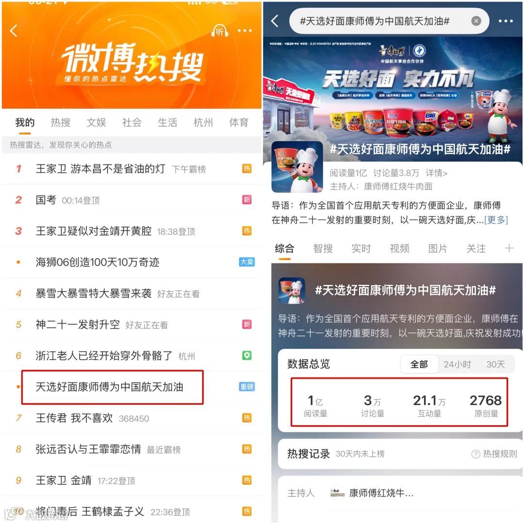 此外,网红大V 何同学与毕导惊喜现身这次活动,为这碗好面加油打气,进一步掀起现场人潮涌动,带动微博相关话题“#天选好面康师傅为神舟二十一加油”登上热搜,成功引爆关注热潮。