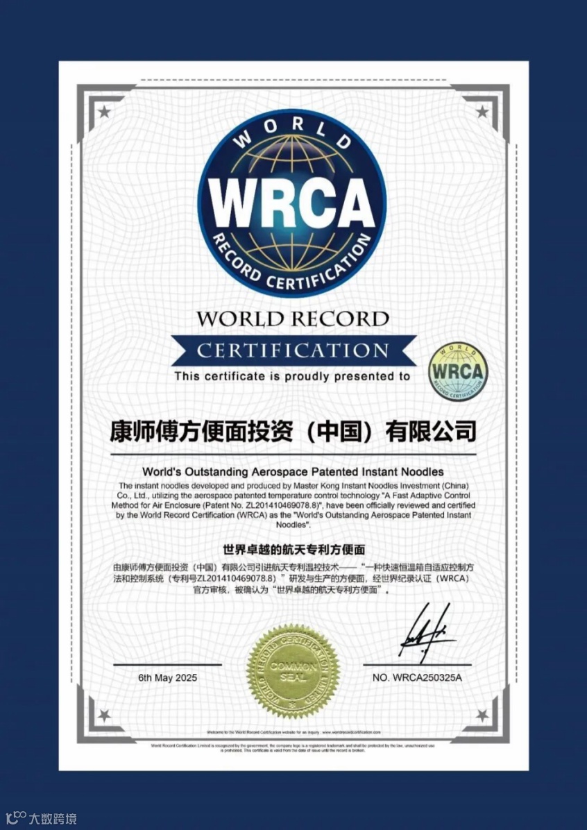 这种认可并非口头上的赞许,而是落在了技术层面。双方共同推动的“航天专利温控技术”,已在康师傅生产线上全面落地。今年5月,这项技术获得世界纪录认证机构(WRCA)的全球纪录认证,成为这一科技实力的又一次外部印证。