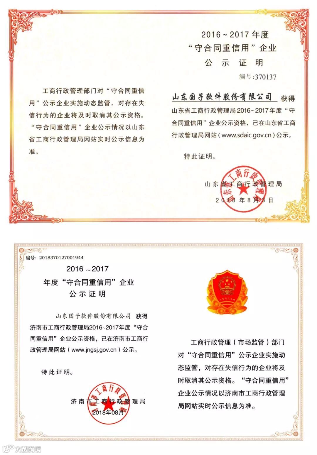 近日,国子软件分别被山东省工商行政管理局和济南市工商行政管理局授予“2016~2017年度守合同重信用企业”荣誉称号。