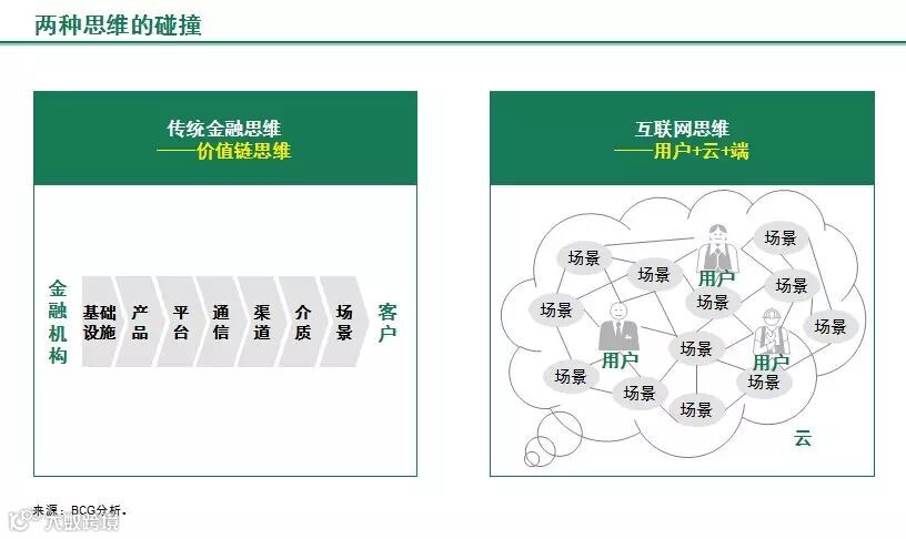 这两种思维有两个最大的不同:一是机构本位与客户本位的不同;二是线性路径与多维网状路径的不同。对传统金融机构来说,“用户+云+端”的思维可能显得过于抽象和简化,给人不知从何入手的感觉;而对互联网公司来说,价值链的思维可能显得过于陈旧和繁琐。但从长远来看,两种思维的相互尊重和理解将是互联网金融竞争与融合的必要前提。
