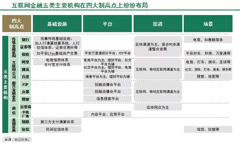 总结来看,互联网金融一共有四个制高点:基础设施、平台、渠道、场景。