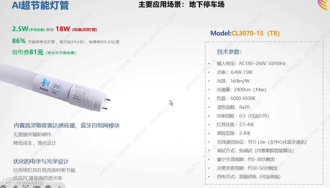 相较于15瓦常亮普通LED灯管,单支15瓦AI超节能灯管平均运行功率不足3瓦,每年可节电105度。按民用0.6元/度电价计算,单支灯管每年可节约电费约63元,若部署1万盏,年节约电费可达63万元;若按商业1元/度电价核算,单支灯管每年为商业物业地下车库节约的电费可超105元,降本成效显著。