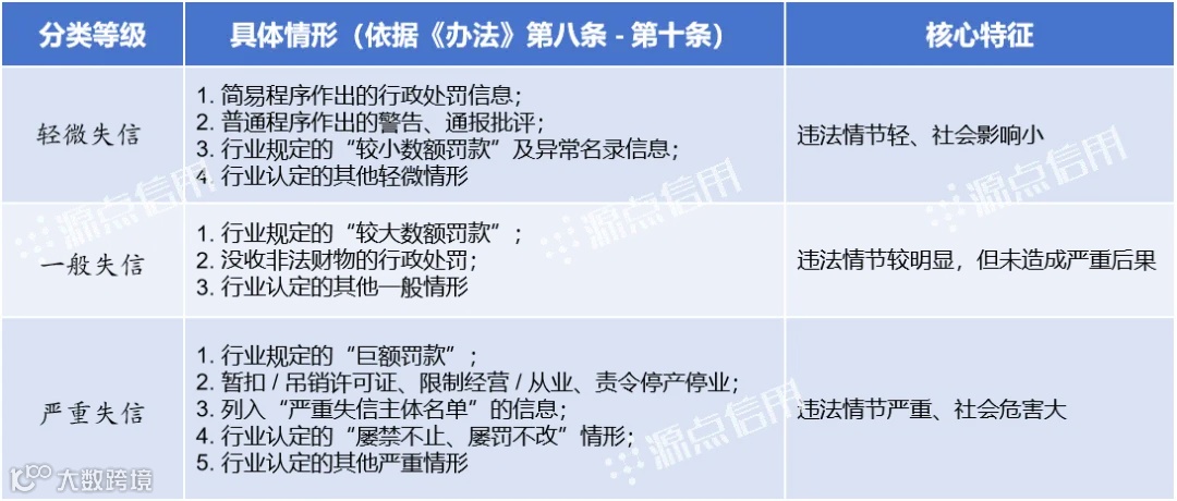 第七条 失信信息按照失信严重程度实行分类管理,原则上划分为“轻微、一般、严重”三类,按照过罚相当原则,分别设置不同的公示期限,公示期限自司法、行政公务文书认定之日起开始计算。