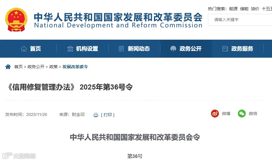 近日,国家发改委印发《信用修复管理办法》,《办法》经2025年11月19日第25次委务会议审议通过,自2026年4月1日起施行。