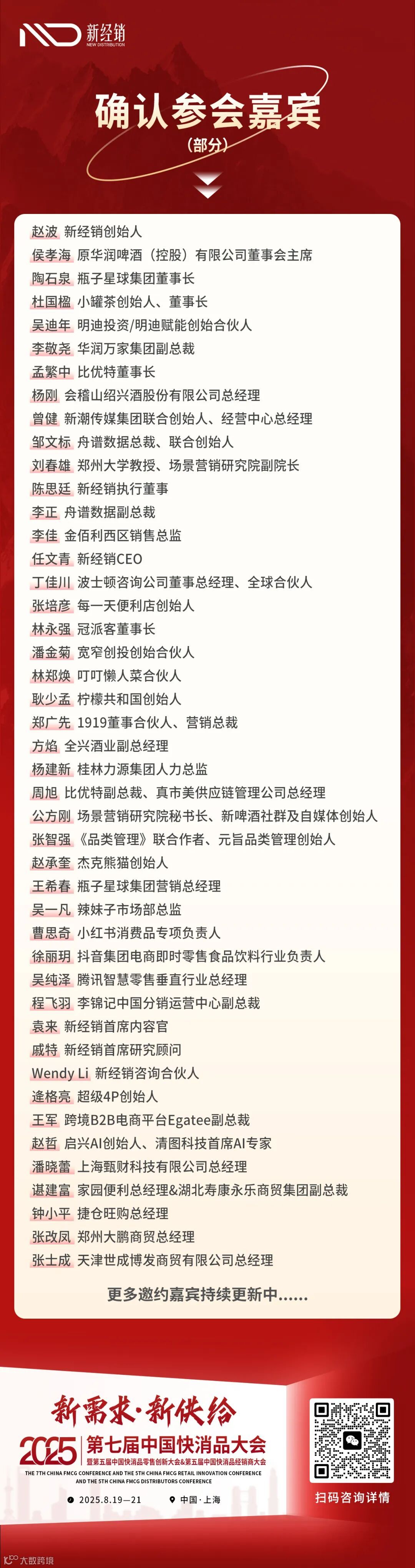 8月19日-21日,上海,【2025年新需求·新供给第七届快消品大会】。我们将汇聚全国优秀经销商、行业代表性 B2b 平台、头部品牌商与零售商等一线操盘者,共同围绕《新需求·新供给下的经销商经营法则与红利机会》这一话题,进行一场底层逻辑与实战经验的系统探讨,系统拆解下一阶段经销商该怎么走、怎么转、怎么赢。