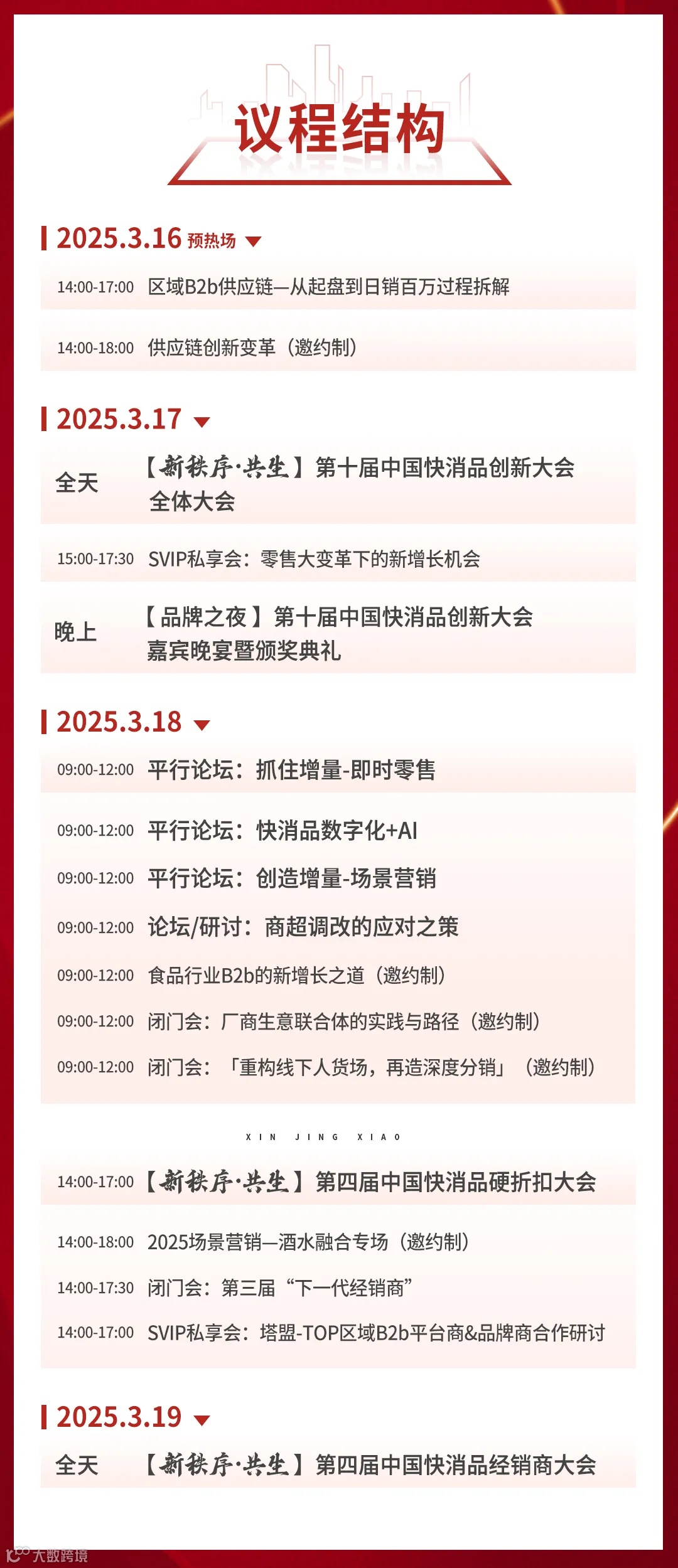 最后,关于调改这一话题,3月17-19日的2025中国快消品创新大会,我们专门设置了「商超调改应对之策的论坛/研讨」,会上我们会站在零售商、快消厂家、经销商三方视角,一同讨论关于调改的认知以及未来的发展和合作,欢迎报名参加!