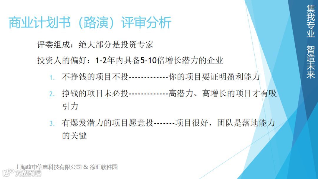 那么如何做好中小企业的政策申报工作呢?作为六年科技政策咨询、代理服务经验,擅长为科技企业的发展制定相应规划的导师,通过时限去筹划、领读近期热议的政策项目,旨在提高园区内外企业对申报的解读和理解能力。并针如何撰写一份评委青睐的商业计划书罗列了重点事项。