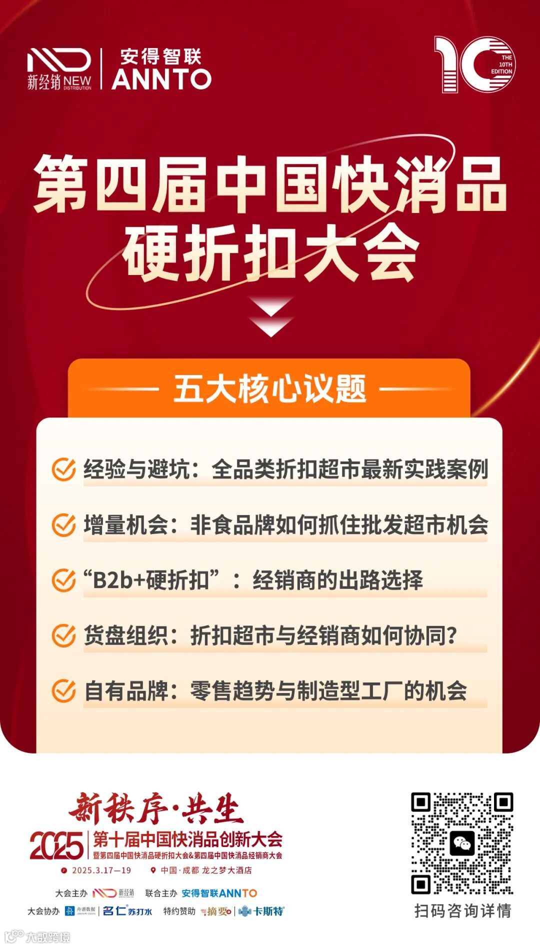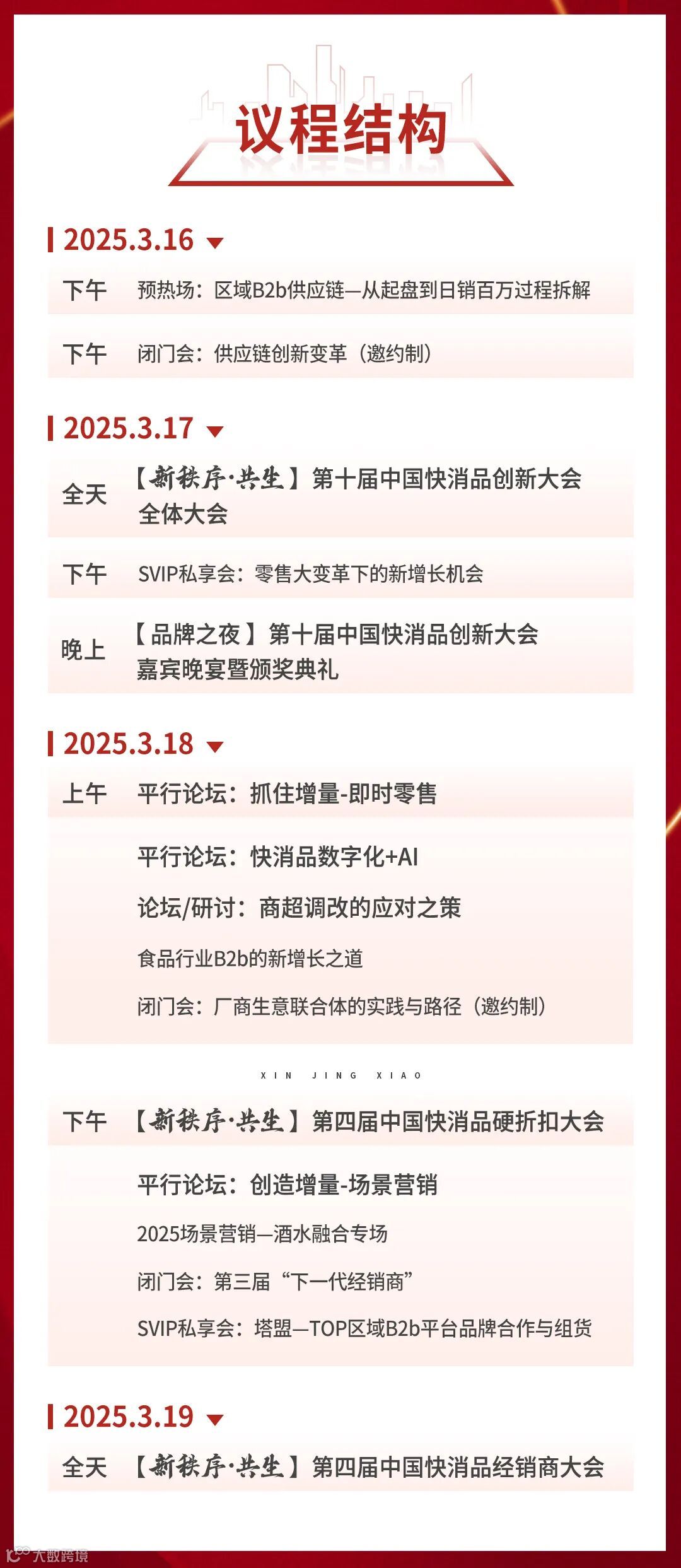 基于此,本届大会围绕【新秩序·共生】为核心主题,3天时间,1场主论坛、1场硬折扣大会、1场经销商大会、1场汇聚上百位快消产业大咖的嘉宾晚宴颁奖典礼、多场高热度话题平行论坛、多场一对一精准对接闭门会议。