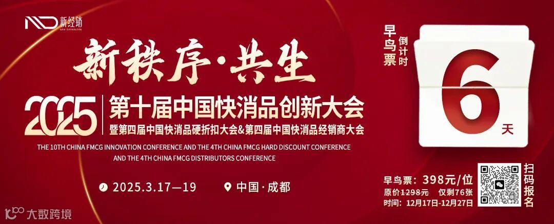 PS:2025年3月17日-19日,「新经销」将发起并主办以「新秩序·共生」为主题,在中国成都举办第十届中国快消品创新大会暨第四届中国快消品硬折扣大会&第四届中国快消品经销商大会。