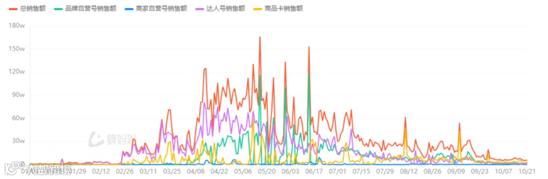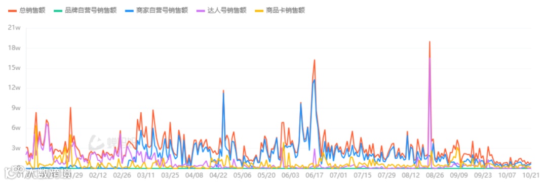 以林源春为例,品牌抖音销售额暴涨的4—7月,也是品牌推广达人数、推广直播场次飙升的时间段。而8—9月品牌推广力度减弱,则对应着该时间段内较低的销售额。