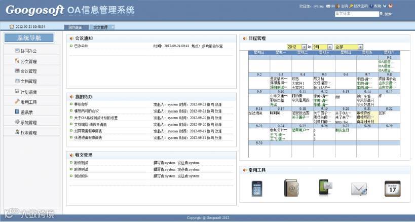 国子软件设计开发的“OA协同办公管理系统”集公文管理、档案管理、会议管理、个人办公等多种功能为一体,全面规范基础管理流程,帮助用户实现过程全监控,提高行政办公效率,最终实现提高决策效能的目的。
