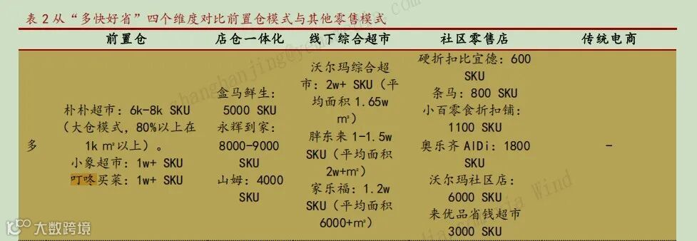 从品类来看,SKU最高的是小象超市和叮咚买菜。华西证券研报显示,小象和叮咚买菜SKU都在1W+以上;其次是京东七鲜(大仓6000+)、盒马(5000+)。