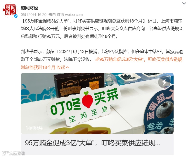 零售是弯腰捡钢镚的苦生意,需要从细枝末节处优化成本、提升效率。这其中也包括内部人员的管理。最近,叮咚买菜供应链规划总监颜某,因受供应商贿赂95万元被判处有期徒刑。2022年,叮咚买菜蔬菜、水产部的相关采购负责人也都曾因受贿被法院宣判。