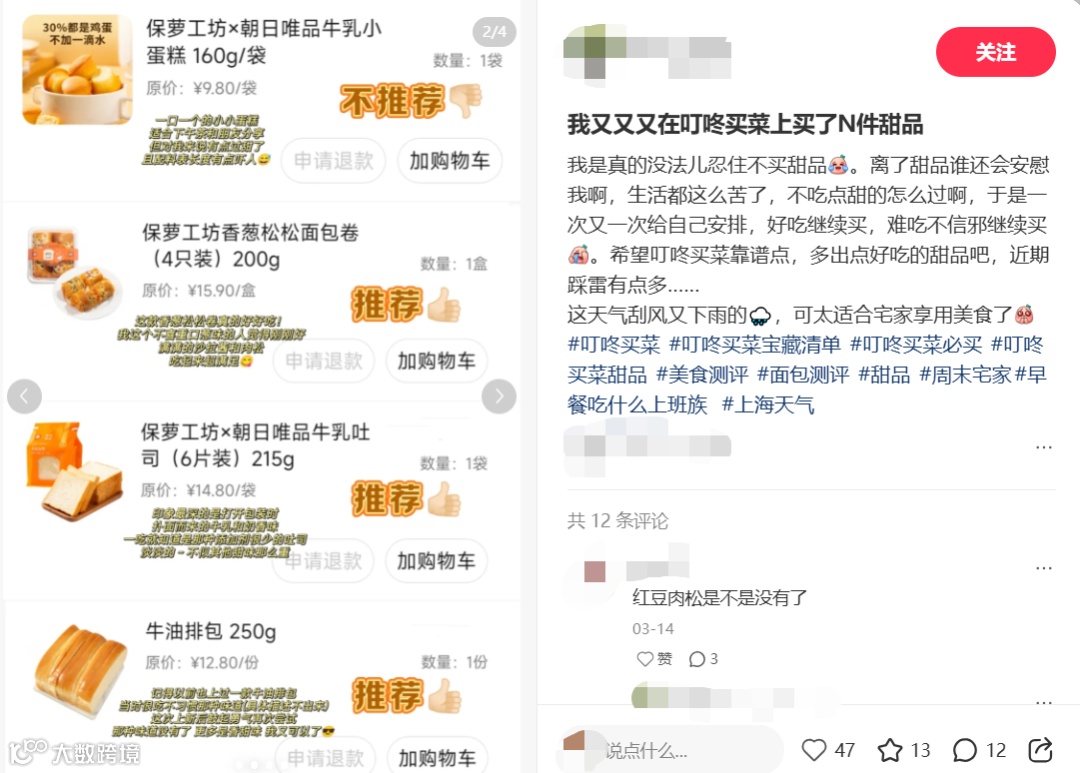 据不完全统计,叮咚买菜的自营品牌已经覆盖肉蛋奶、谷物,等多种食品,其中也包括毛利50%以上的烘焙赛道。笔者注意到,叮咚买菜的甜品糕点产品在社交平台上好评颇多,除了榴莲千层、瑞士卷等网红款,也有“酸奶夹”“脆墩墩”等独家的特色甜品。