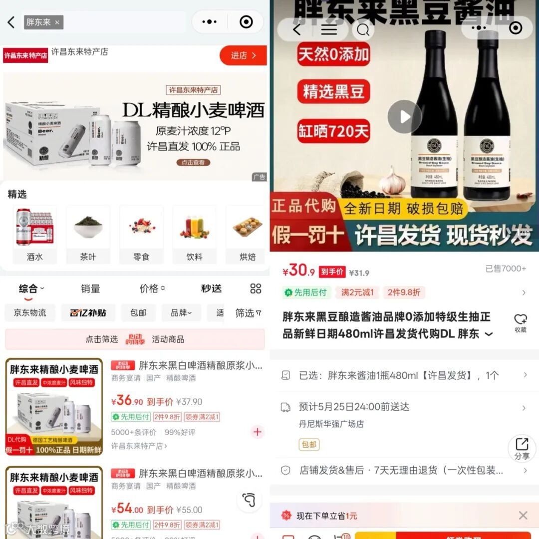 一个细节是,在京东上搜索“胖东来”,搜索结果第一名是一家名为“许昌东来特产店”的店铺,该店特别注明“正品代购、许昌直发”,而店内销量排名第一的是DL黑豆酿造酱油,第二名就是DL精酿小麦啤酒。