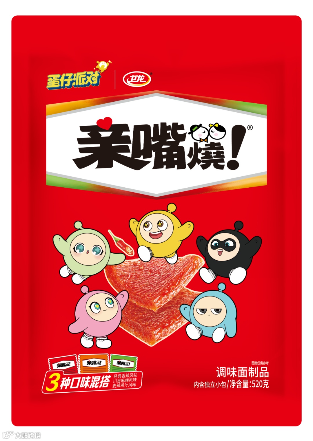 不止于此,在榴莲辣条热销的同时,卫龙也官宣了与潮玩手游《蛋仔派对》的联名活动,推出了亲嘴烧联名礼盒。
