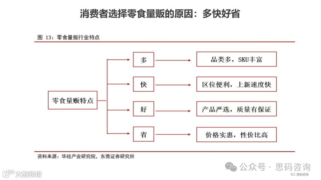 但是换个角度来讲,如果是个买东西的人,你肯定希望说能不能用50、60能够买到一个你觉得是300的东西,希望能达到花的少,买得好的效果。量贩零食能满足消费者的“多快好省”的需求。从这个角度出发,就能想清楚量贩零食为什么发展得快了。