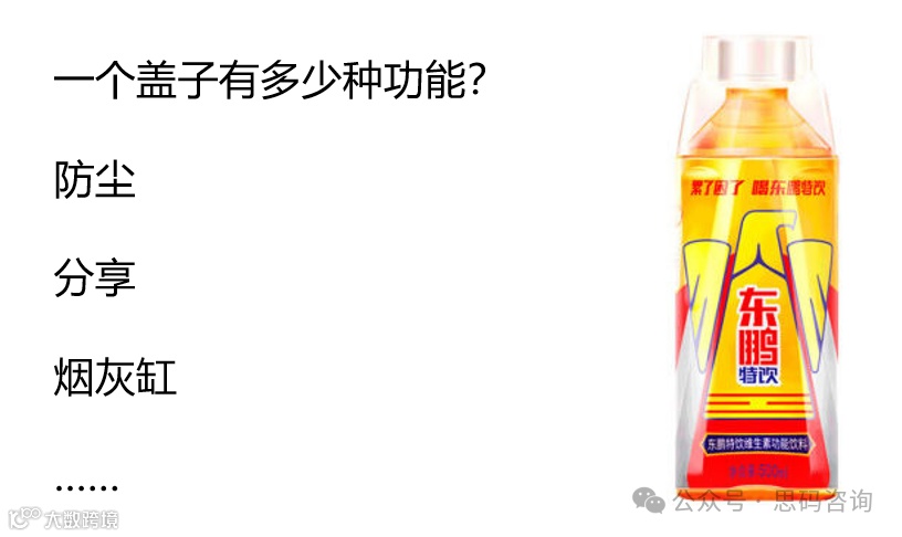 产品功能。产品具备多功能,能满足目标人群的多样化需求。以饮品为例,很多饮品配备的盖子就有多种功能。东鹏特饮它的盖子不仅能起到防尘作用,在售卖过程中,还方便人们分享饮品,喝不完的饮料可以用盖子给别人倒半杯,甚至这个盖子还能当作烟灰缸使用。