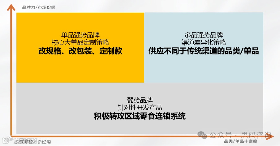 如果想要在销售商品的同时还能盈利,可以考虑推出一些非主流单品,或者具有差异化、定制化的产品,通过定制化包装来吸引年轻用户。我们在量贩零食店里能看到一些小规格、特殊口味的产品。虽然贴牌是可行的,但实际上,很多品牌并不愿意这么做。