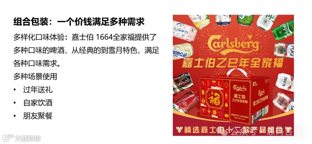如何能够让消费者买单,要给够足够的理由。厉害的产品,它就能够做到一个产品组合,在多个场景当中去做到连接。嘉士伯旗下有一款组合产品,它既可以做我们的这个新春礼盒,也可以拿回家里自饮,还可以多人聚餐,享受不同口味。