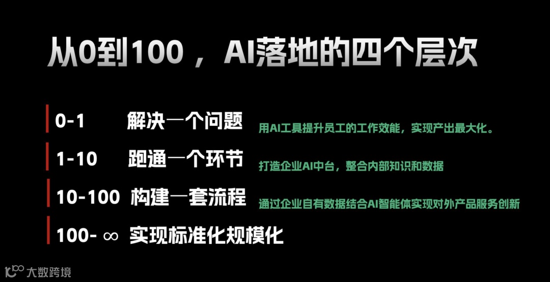 AI深度融入到各个业务环节。那些零散的成功经验被总结、提炼、标准化,让AI的优势在更广泛的场景中不断复制和放大。无论是生产、营销,还是客户服务,都能通过标准化流程将AI解决方案快速落地,实现高效、精准、可控的业务运作。