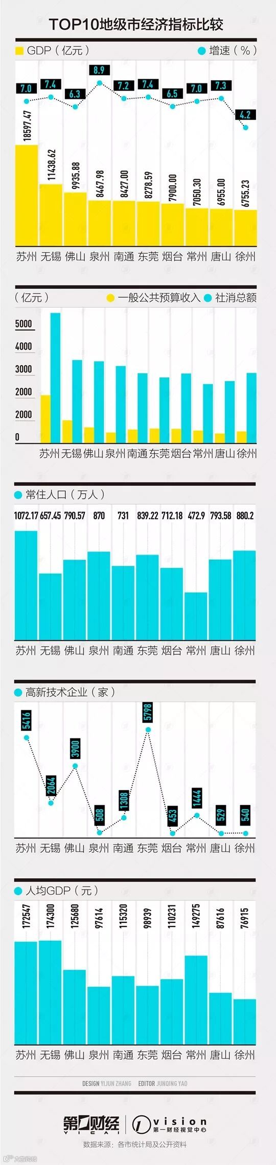 按GDP总量的大小来看,普通地级市前十强分别是苏州、无锡、佛山、泉州、南通、东莞、烟台、常州、唐山、徐州,全部来自东部沿海地区,其中江苏最多,一省就占了5个,此外广东有2个,福建、山东和河北各1个。