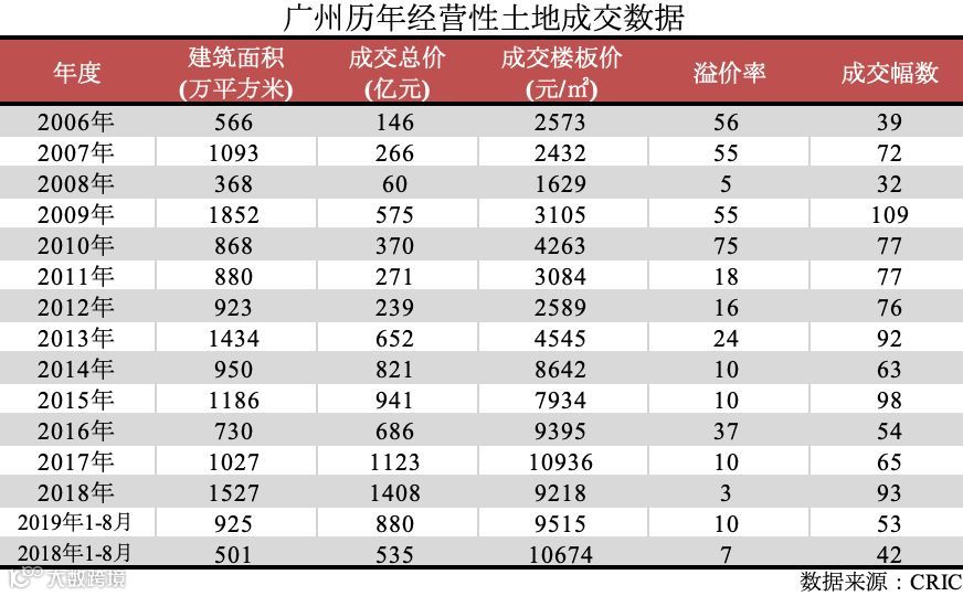 克而瑞的数据显示,这一年,广州卖出了109幅地。其中住宅用地出让面积与2008年同期相比大幅增加了158.9%。
