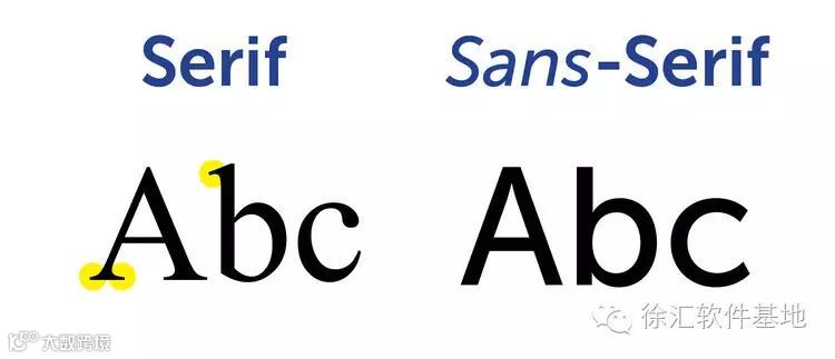 做个小科普,下面这张图就是衬线字体(serif)和非衬线字体(sans-serif)的区别,黄色的部分极为装饰性“衬线”:
