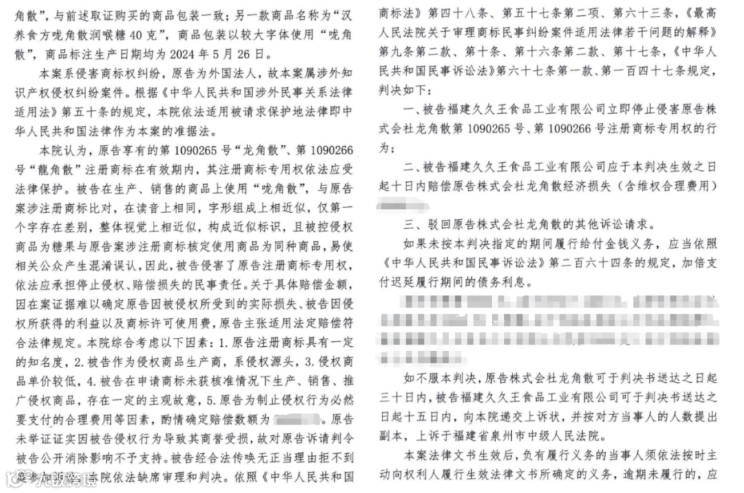 (图注:龙角散维权案件判决书)