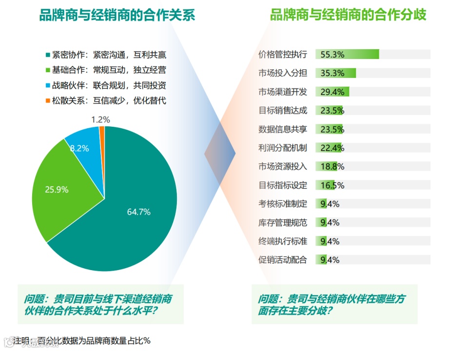 但由于市场竞争加剧,价格体系与渠道利润难以平衡,这导致品牌商与经销商在价格管控执行方面(55.3%)产生合作分歧,直接影响了品牌商与经销商的合作关系。