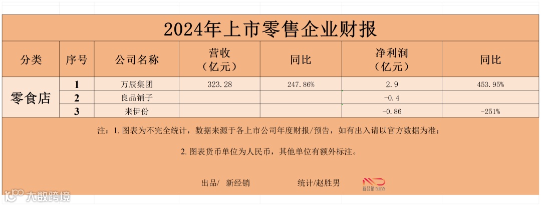 万辰集团凭借量贩零食业务实现了飞跃式发展,全年营收达到323.29亿元,同比增长247.86%;净利润为2.94亿元,同比增长453.95%。