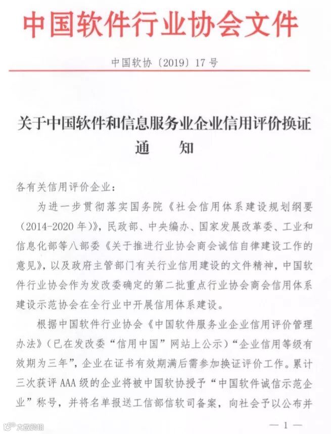 下方“阅读全文”内,点击下载:中国软件和信息服务业企业信用评价2019年换证通知.pdf