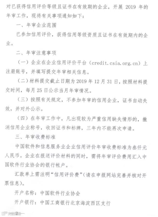 下方“阅读全文”内,点击下载:中国软件和信息服务业企业信用评价2019年年审通知.pdf