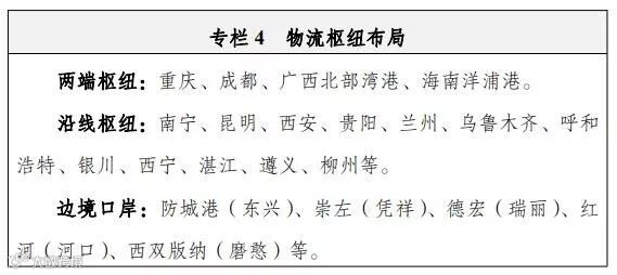 枢纽建设方面,北部湾成为重庆、成都之外第三个被点名的地区,定位是国际门户港。此外广西其他城市也收获了通道红利,比如南宁、柳州,和贵阳、昆明等地一起,被定位为重要节点城市和物流枢纽。