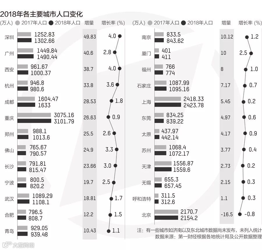 第一财经今天统计了国内主要城市的常住人口数据,发现增幅最大的10个城市如下: