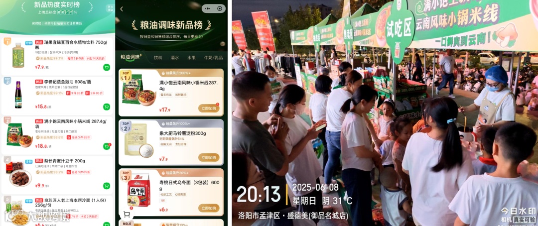 线上产品营销声势浩大,线下新品进场也全军出击。仅用三周时间,云南小锅米线就已完成107个重点渠道、6000+网点的强势进驻,迅速拿下小象超市「粮油调味新品榜」TOP1、叮咚买菜「新品热度榜」TOP3等热门榜单,并在华南、华东、华北、西北、河南等地区,以破竹之势开展了一系列推广活动。在大张盛德美孟津店,新品mini秀活动单日POS突破7000元,PSD高达477,活动仅开展两日即完成了销售破万的目标。