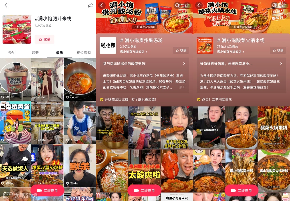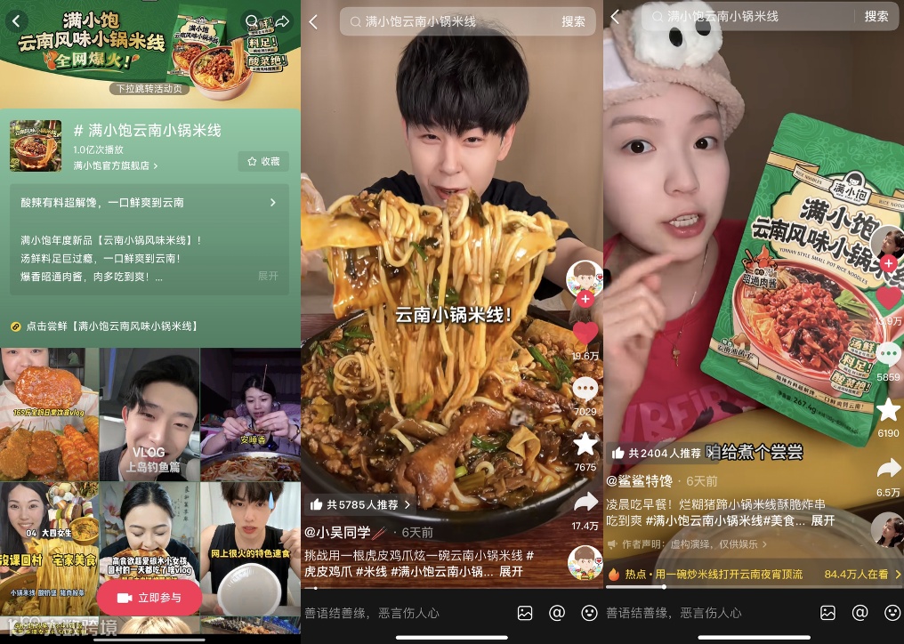 在线上,满小饱联合头部美食博主做测评,在抖音和小红书铺设数百位高质量KOC种草,通过短视频内容、爆文笔记和直播带货快速引爆声量。不到一个月时间,#满小饱云南小锅米线#话题播放量已突破一亿。