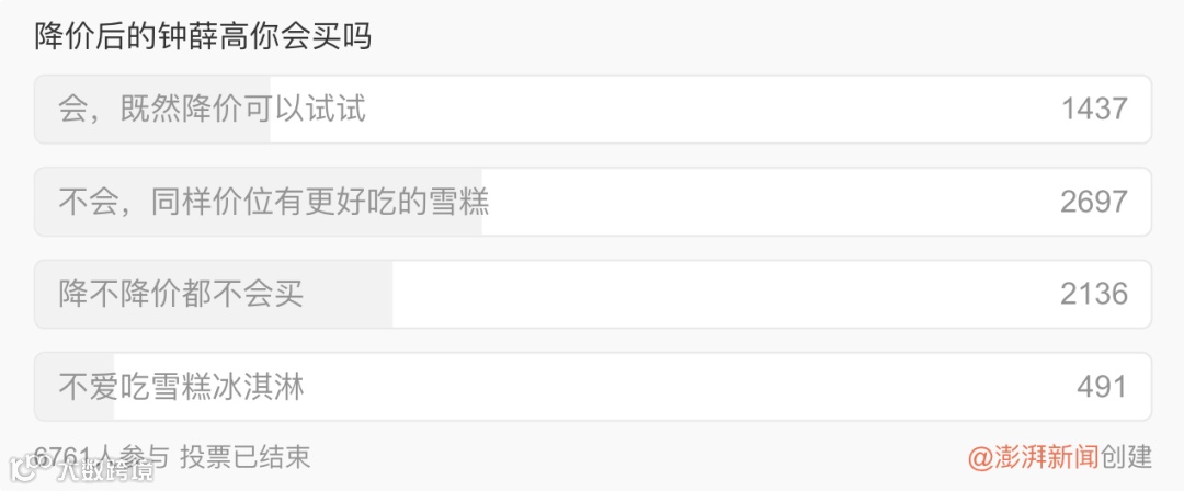 澎湃新闻曾发起一项“降价后的钟薛高你会买吗”的调查,结果有超过70%的人表示不会。
