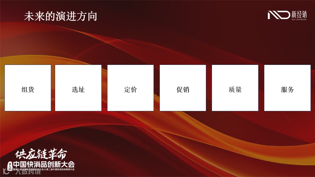 未来的演进方向,简单讲一下框架,就是组货、选址、定价、促销、质量、服务,前面四个就是传统说的零售4P,后面的质量和服务,更多的是从消费者价值升维的角度去思考。