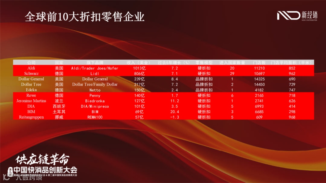 在所有的折扣业态中最亮眼还是硬折扣,上图是全球前十大折扣公司的排名,其中有7家是硬折扣,3家是品牌折扣,也就是软折扣。