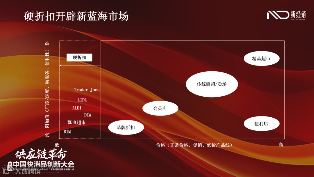 所以这个时候硬折扣价值定位变得非常清晰,一旦当你的选品极具减少,零售业态的附加值极具降低时就会发现,消费者变得非常功利,他来到你的门店就是图便宜,如果你的商品能够给他超值的体验,那么就会形成复购,这就是硬折扣开拓蓝海市场的方式。