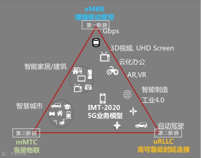 第一阶段,“增强移动宽带”,以人为中心的应用场景,集中表现为超高的传输数据速率,广覆盖下的移动性保证等。在5G的支持下,用户可以轻松享受在线2k/4k视频以及VR/AR视频,用户体验速率可提升至1Gbps(4G最高实现10Mbps),峰值速度甚至达到10Gbps。