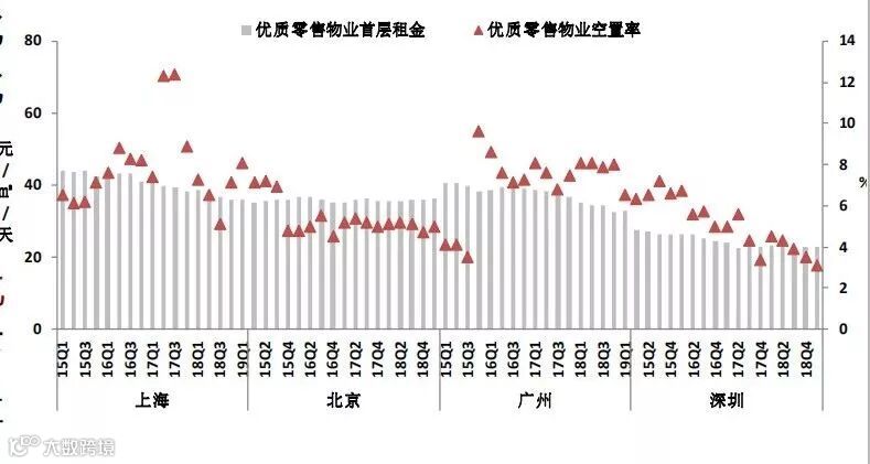 图:2015年-2019年一季度一线城市优质零售物业租金及空置率